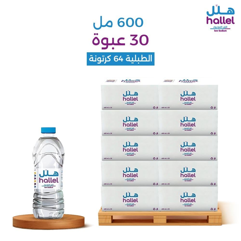 طبلية ماء "هلل" 600 مل تأتي مع 30 عبوة لكل كرتونة مما يتيح لك الحصول على كراتين ماء بالجملة بسعر اقتصادي كل طبلية تحتوي على 64 كرتونة لتوفير احتياجاتك اليومية من المياه دون القلق بشأن نفاد المخزون.